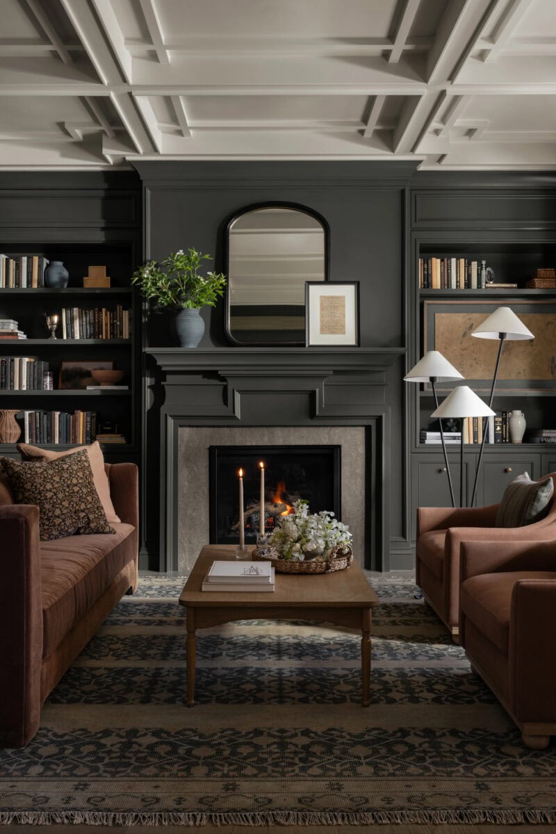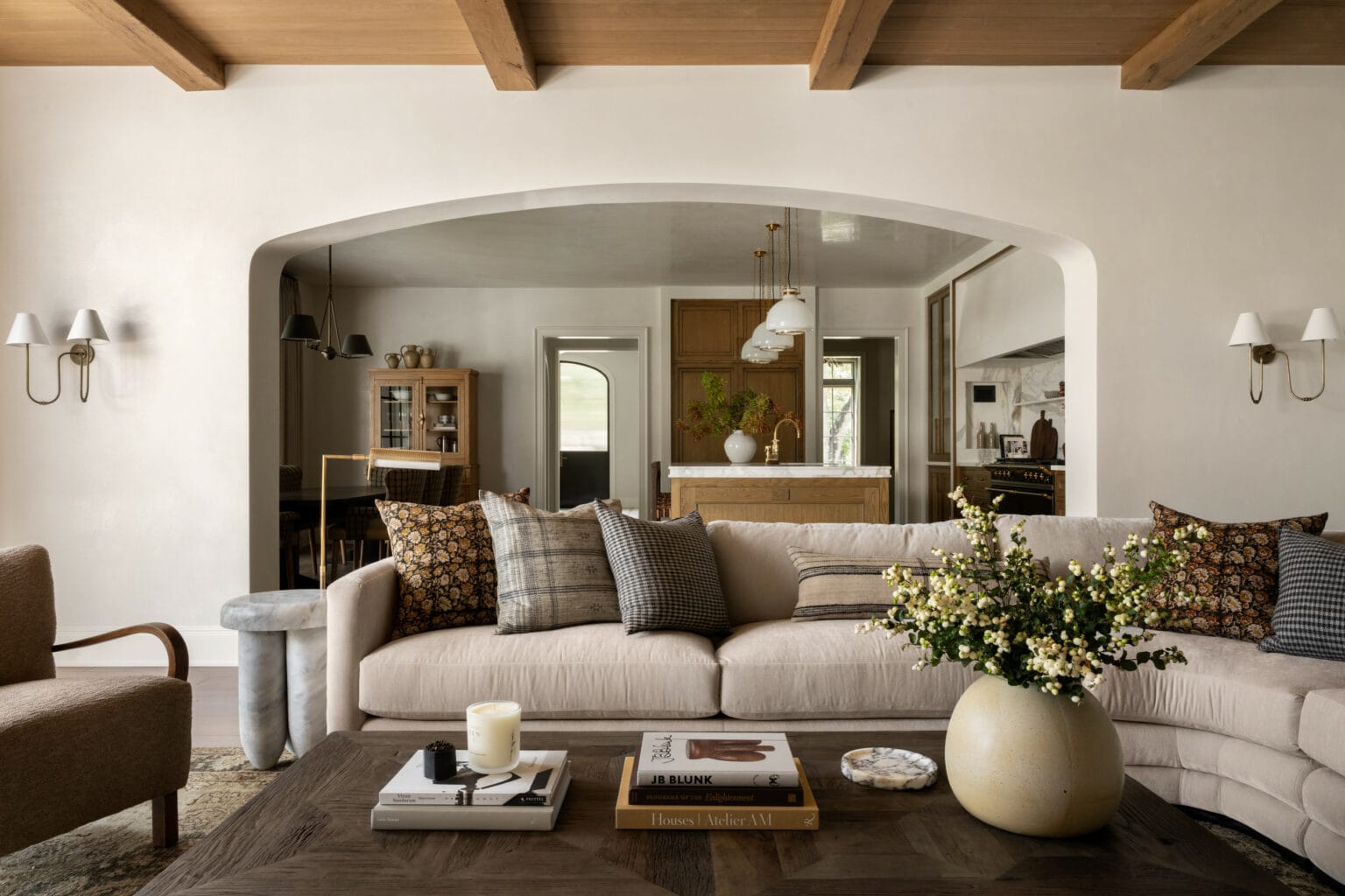 Empurrar todos os móveis contra as paredes na tentativa de “ganhar espaço” é um equívoco que prejudica a fluidez. No entanto, ao trazer o sofá e as poltronas para o centro, você cria áreas de conversação mais íntimas. Nesse layout, as cortinas sob medida ao fundo servem como uma moldura elegante, preenchendo o vazio das paredes e adicionando profundidade visual ao conjunto.
